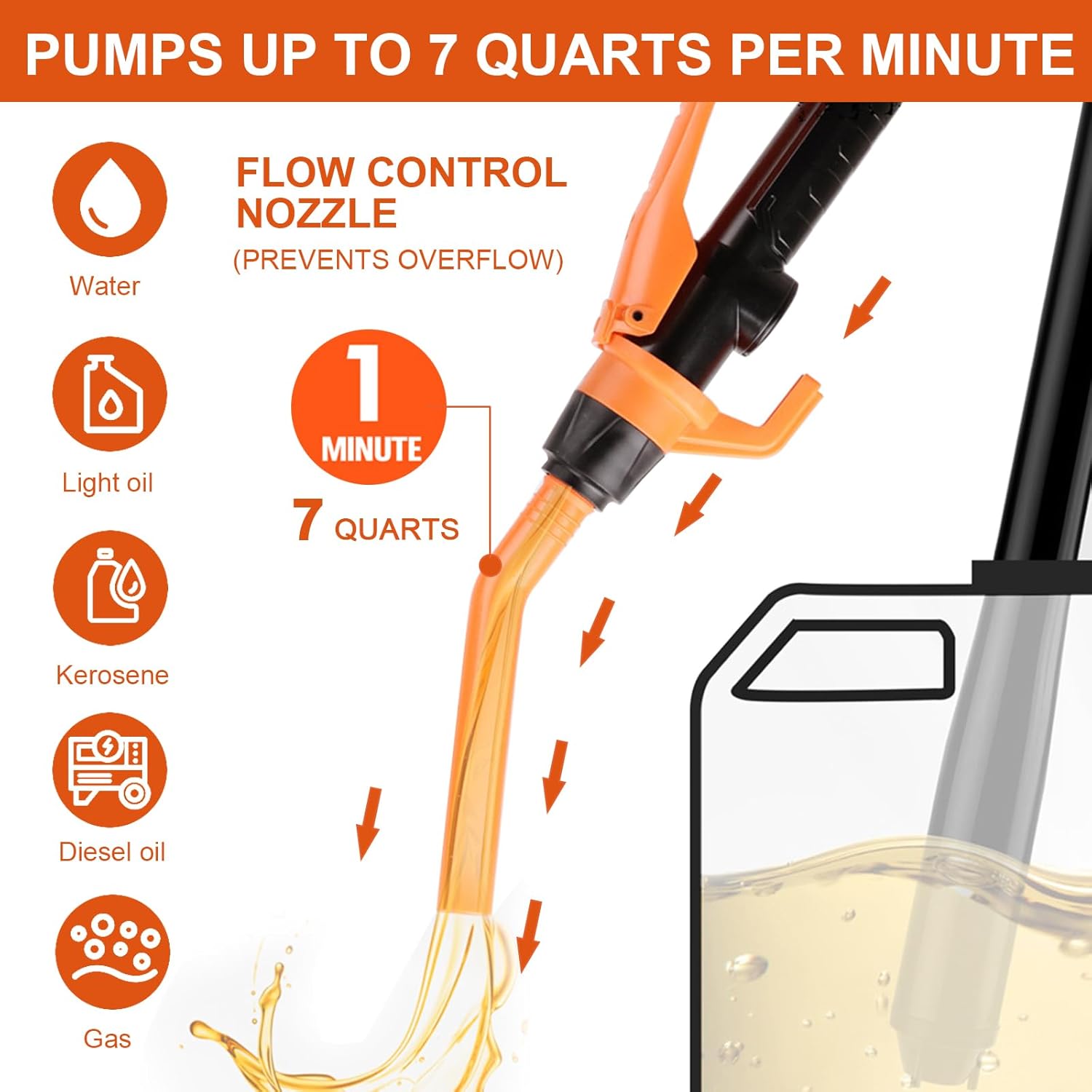 Easy to use: to use this canning pump, you just need to press a button. The pump can be operated with one hand or 100% hands-free without having to lift heavy items! With this practical portable petrol pump, you can transfer liquids safely and easily. Whenever you need petrol, you can use our pump yourself.