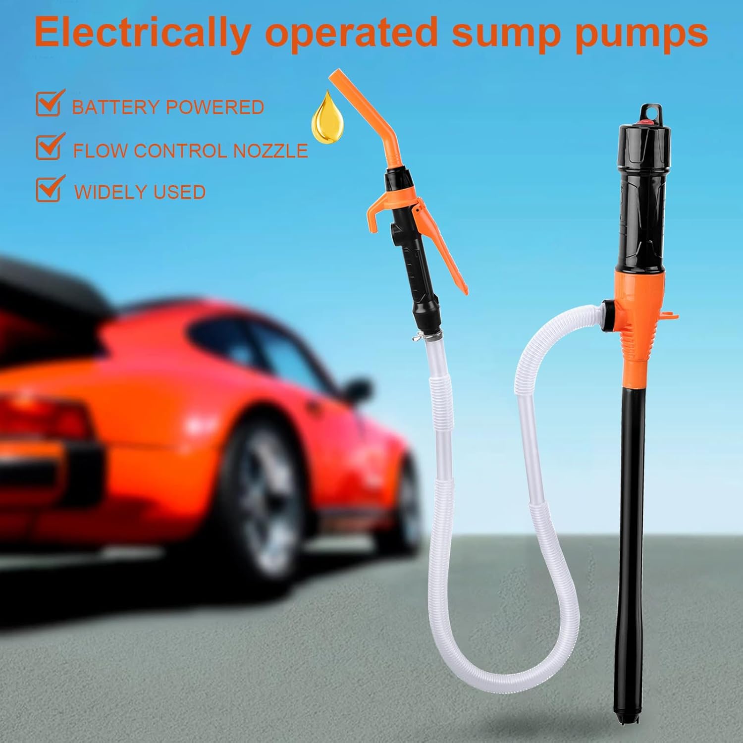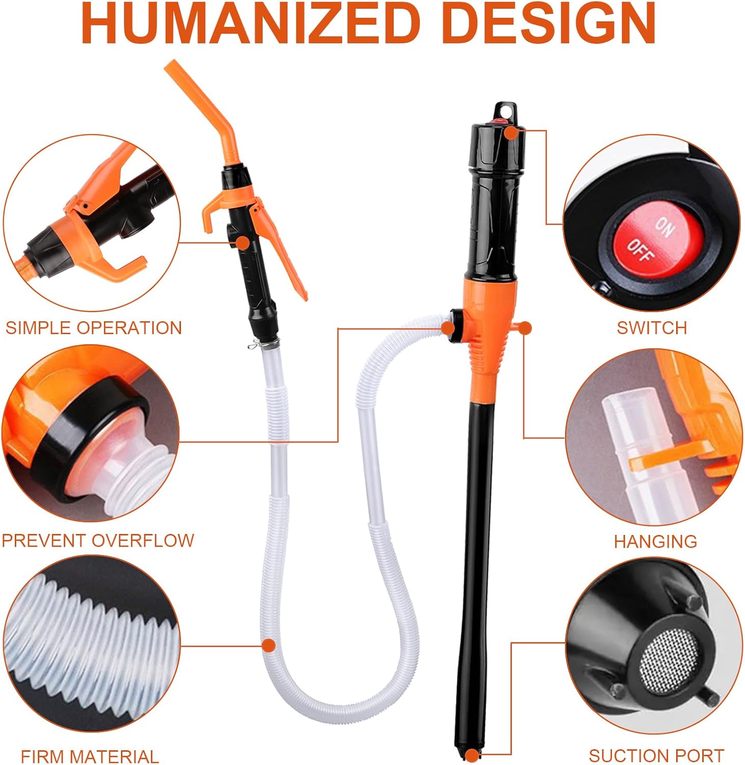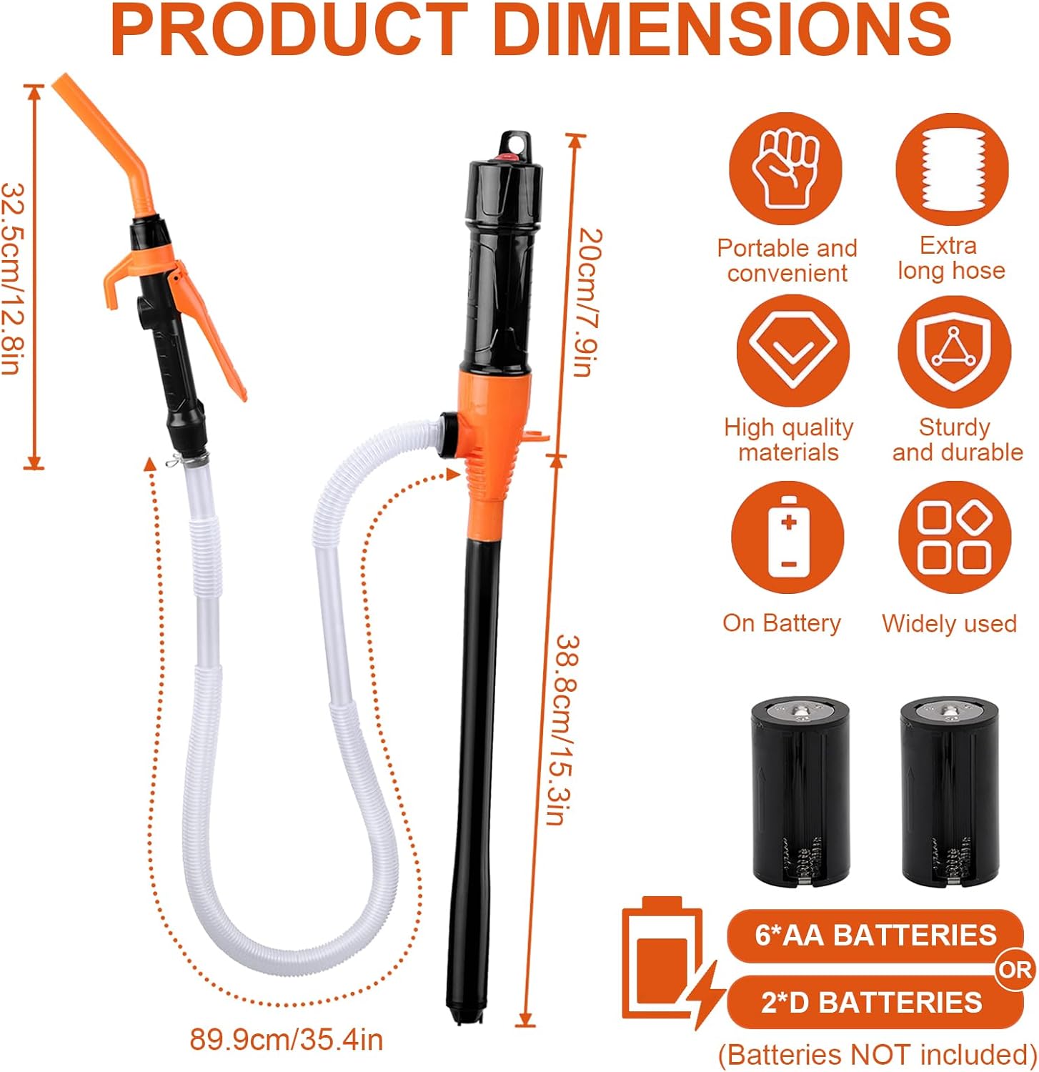 Comfortable to carry: Can be powered by 2 x D batteries or 6 x AA batteries (batteries not included). Slide switch design, simple and convenient; The hook design on the top is easy to store and use, the connection between the hose and the pump is pre-fixed, so you don't have to worry about connecting the hose or worrying about leakage.